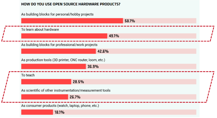 The survey also asks participants about their motivations (Fig. 11). We can also see that after the traditional hobbyist use of open source hardware, more people are now using OSH to learn about hardware itself. Because open hardware ideally comes with documentation that allows others to understand what is happening, it is an ideal practice to learn how devices work. In this 2021 survey we also see that almost a third of respondents mention they use open source hardware to teach or do research, which was not very frequent in previous years.