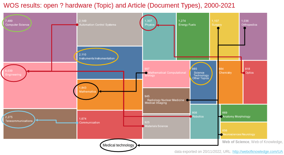 Following up on the analysis of OSH publications, we can also disaggregate the results to illustrate which scientific fields are the most prominent(Fig. 12). While computer science and engineering return the most results, the open hardware approach has been taken up within many other disciplines. Particularly in medical applications, open source hardware is gaining traction.