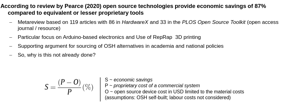 One of the reasons why researchers are using and developing open source hardware is because of its more accessible cost. A study by Joshua Pearce[4] examines articles in the specialized journal HardwareX and the PLOS Open Source Toolkit. They concluded that in some cases researchers could save up to 87% costs by using open source hardware(Fig. 7).