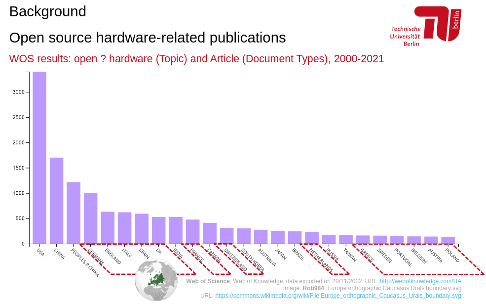 Fig. 2 Open source hardware-related publications by country, extracted from Web of Knowledge on 20/11/2022#