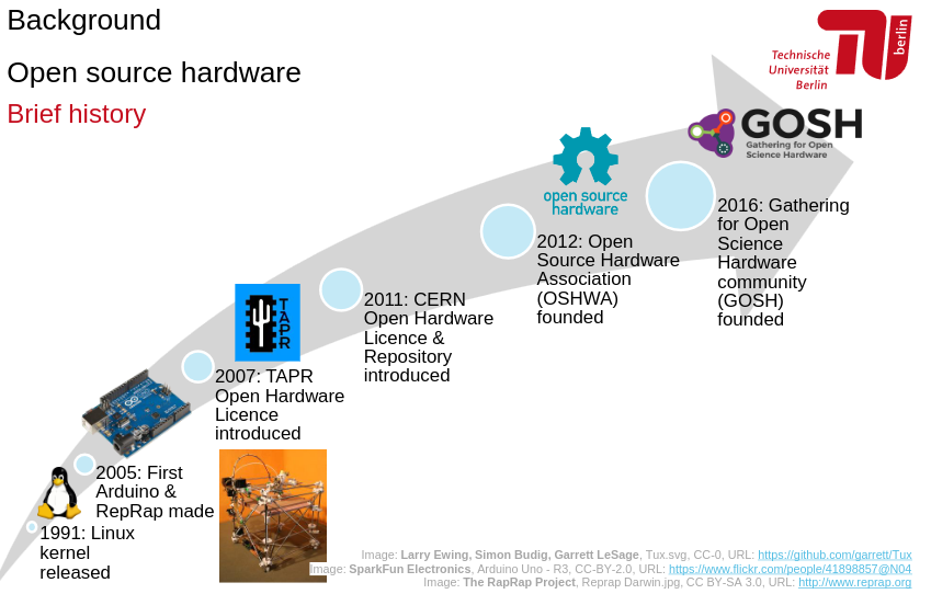 Most recently, in 2016, scientists and enthusiasts of science and education around the world created a new community, subdomain of OSHWA: the open science hardware community, or GOSH. GOSH has been very active in the last five years, as the open science movement provides momentum for open hardware in science and there has always been a strong push from science in open hardware.