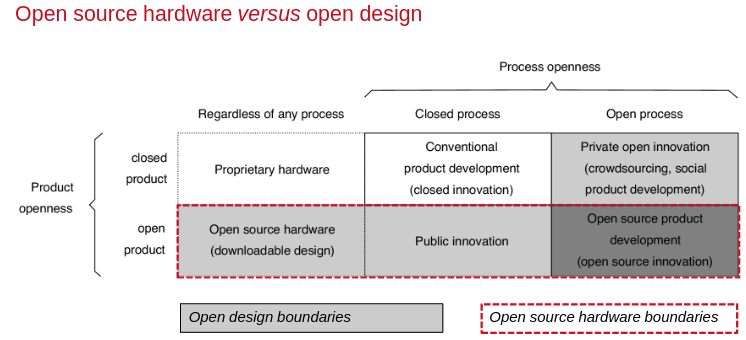 A 2021 paper[3] explains the alternative routes for product development, including open source hardware (Fig. 6). Conventional development of products takes place within the Research & Development department of a firm. The norm is that designs are not shared outside the boundaries of the company: it’s both product and process-closed. One alternative that has become more popular recently is open innovation, where companies crowdsource ideas from the users community, or employ crowdfunding mechanisms. These processes open the ideation stage of product development, but most of the time lead to closed or proprietary outcomes.