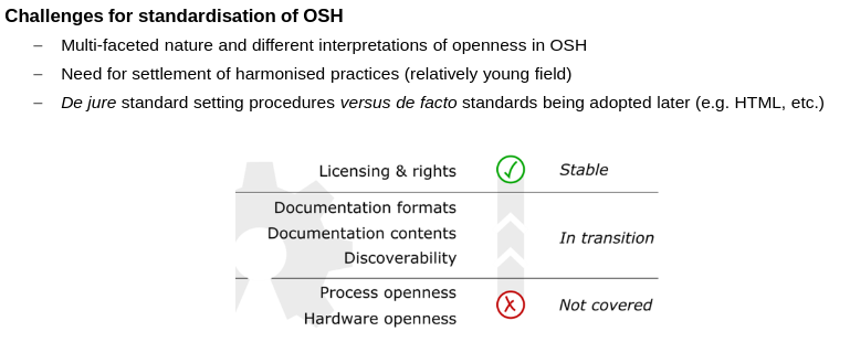 However, there are some key challenges that are preventing efficient standardisation (Fig. 8). Although the definition is more than a decade old, there’s still variety in the interpretations of what openness means, which translate to practice. Compared to FOSS, FOSH is a young field; the OSH definition is adopted in terms of licensing, but doesn’t necessarily translate to other domains. It is not uncommon to find OSH projects using OSH licences but without documentation, or with very poor quality docs. This is a very important issue, as it determines if someone can truly use or contribute to a project.