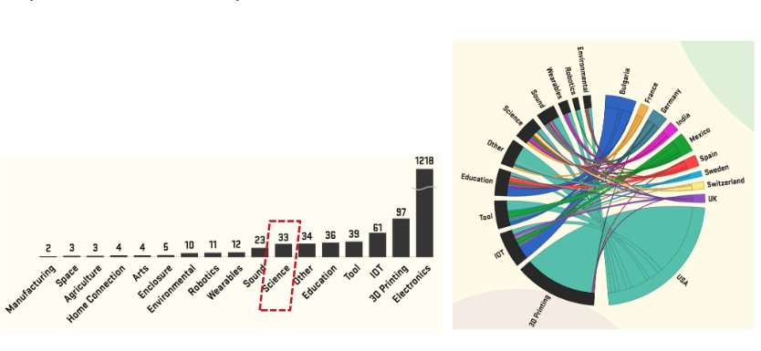 OSHWA publishes a periodic report based on a survey to the community, called the state of open source hardware using data from their certification database. In the last 2021 report[12] we see that science is gaining traction among very strong fields in open hardware, like electronics, 3D printing and education (Fig. 10).