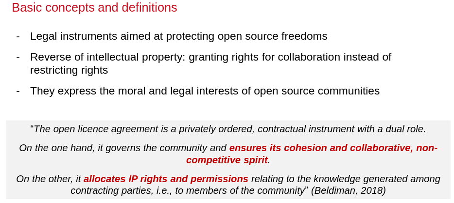 Open licences are the concrete instruments were the freedoms for the user are established. This fosters a collaborative environment where individuals can contribute to and benefit from the collective knowledge and skills of the community. Contributors understand how their work can be used and how it can not, facilitating a transparent and cooperative approach to software and hardware development.