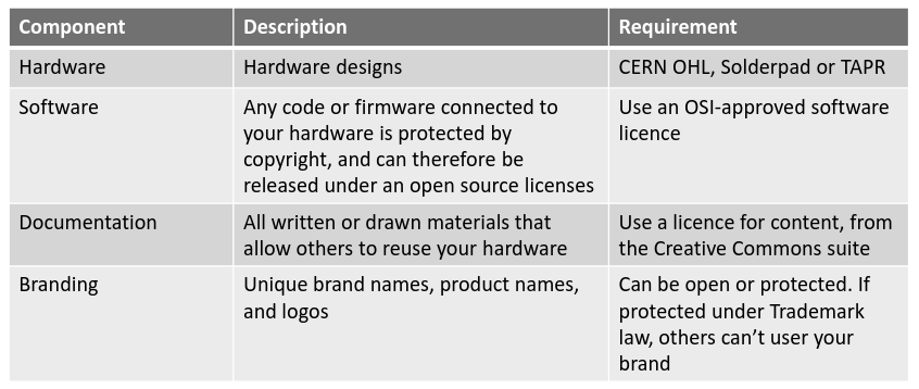 One reason behind this is that most of the time there is a misunderstanding of what can be licensed and how in OSH. The OSHWA certification program explains these differences by calling to considerate four main components of an OSH project: