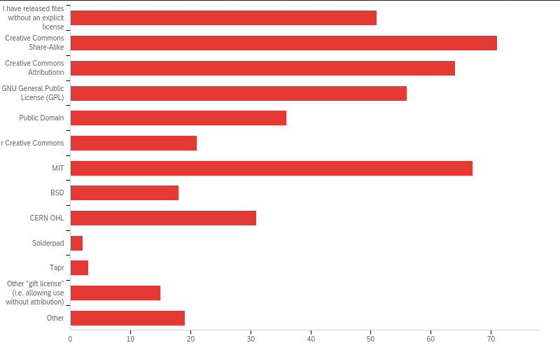 Fig. 32 shows that the practices regarding licensing in OSH communities are still heterogeneous. Even when the recommended licences for OSH, recommended by OSHWA, are the three ones mentioned in the previous section, we still find many software and creative commons licences used (Fig. 32).