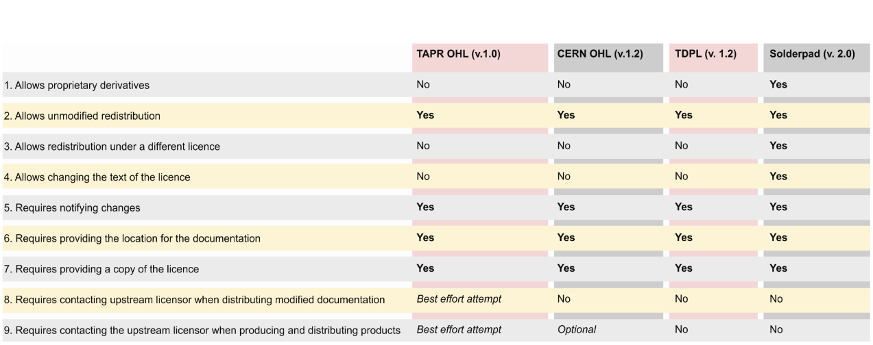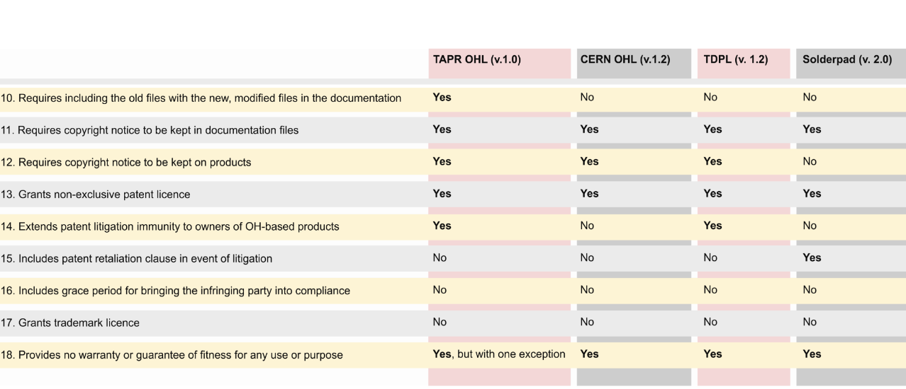One of the latest efforts in OH licensing was the “Solderpad licence,” drafted by an attorney with long experience in open licensing, Andrew Katz. In 2010, Katz released a document on a public mailing-list with “tracked changes” on the Apache licence version 2 to create a “permissive” alternative for hardware. His intention was to demonstrate that little modifications would, in fact, be necessary to create a new licence, filling an important gap where reciprocal licences existed, such as TAPR, CERN OHL, and TDPL.